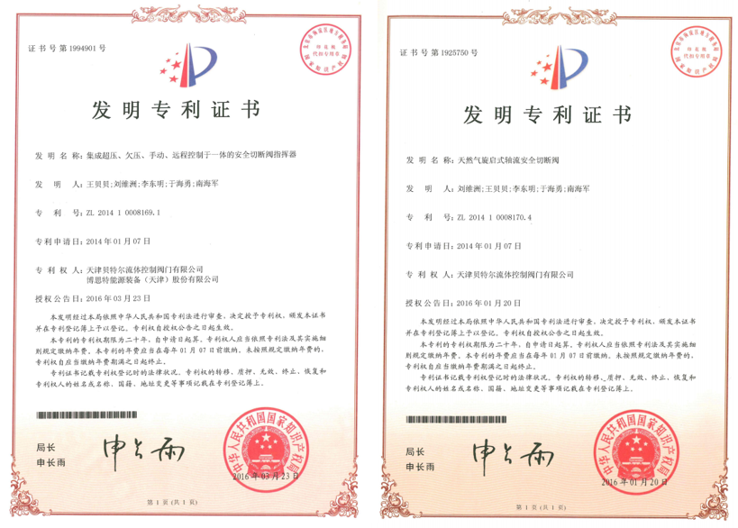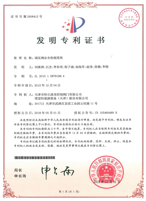 博思特和贝特尔公司联合申报的“调压阀安全检测系统”(专利号ZL 2015 1 0878188.4)经过国家知识产权局的实质审查后正式予以授权发明专利