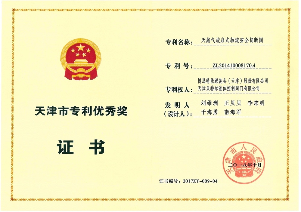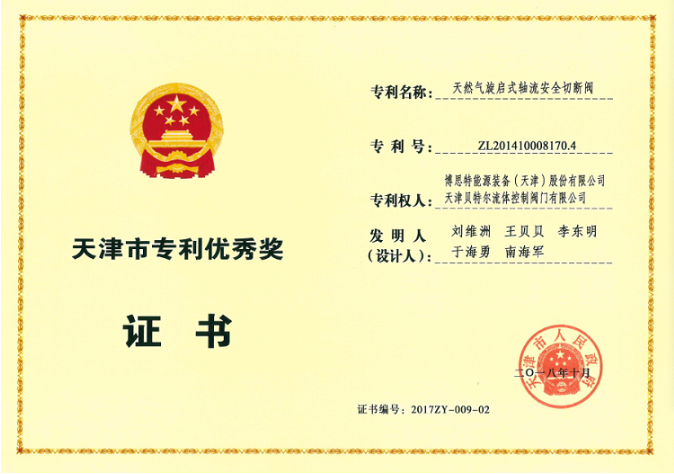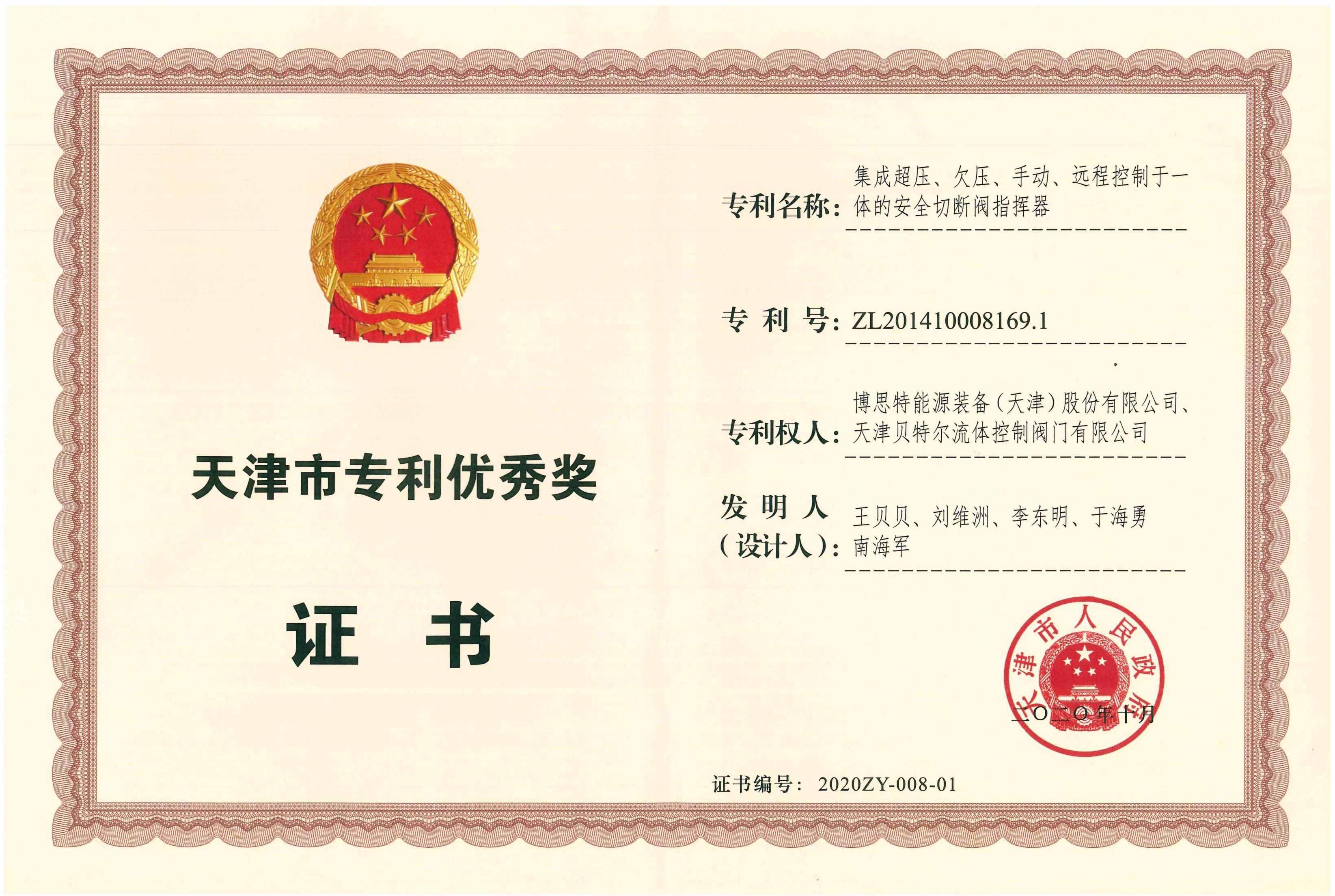 贝特尔“安全切断阀指挥器 ”获天津市专利优秀奖