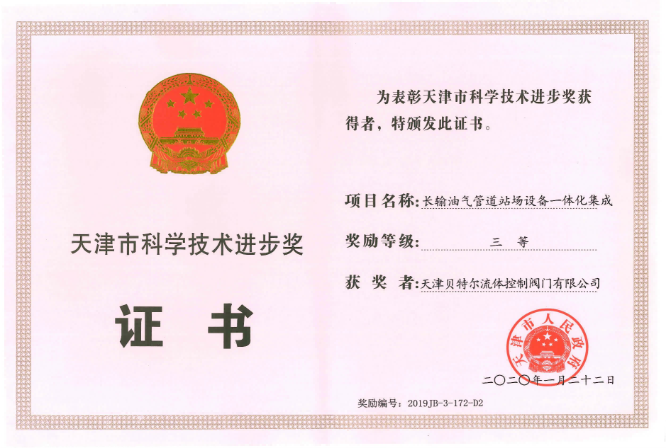 贝特尔“长输油气管道站场设备一体化集成”获天津市科技进步三等奖