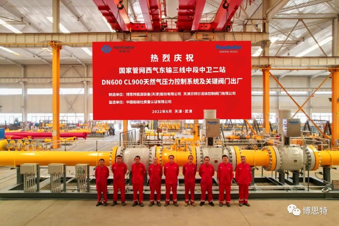 2022年7月,由博思特公司生产的西气东输三线中段中卫二站工程DN600 12Mpa压力控制系统及关键控制阀门陆续顺利出厂。此次出厂的7台套压力控制系统是目前国内压力最高、口径最大、一次交付路数(台套)最多的长输天然气管道场站用压力控制系统设备。其中的安全切断阀和电动调节阀均由博思特的全资子公司天津贝特尔流体控制阀门有限公司提供,是继中俄东线长岭站后又一全部使用国产大口径关键阀门的压力控制系统设备。此项目的顺利交付,标志着博思特正以多年积累的核心技术和行业经验向大口径、高压力和更高技术要求迈进,用科技创新的力量为国家重大能源通道建设做出贡献。 -