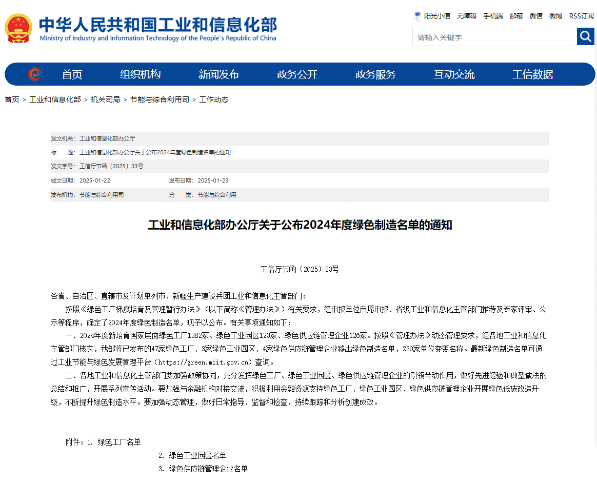 国家级绿色工厂是由国家工业和信息化部负责宏观指导、组织评价标准、遴选发布。“绿色工厂”代表着企业在用地集约化、原料无害化、生产洁净化、废物资源化、能源低碳化等方面的高标准实践。